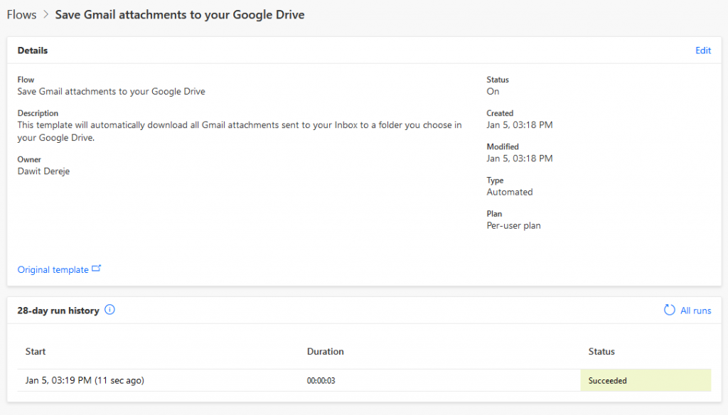 When the flow is created the details of the workflow will be displayed showing information such as the title, description, who created the workflow, when the workflow is created and etc. A history of the workflow’s run are displayed at the bottom providing the results of each run showing whether they were successful or not.