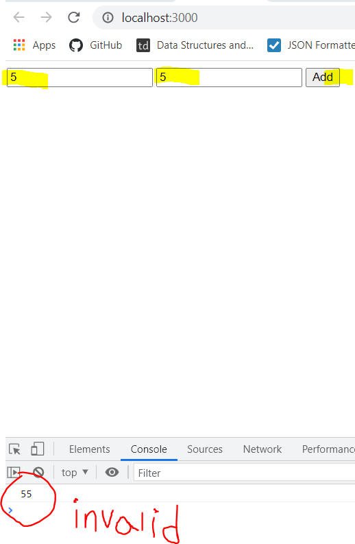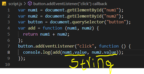 if we open index.html file and put some numbers in the input field, and press add button. we won’t get the exepected result in the console. Rather we get concatination of string values.