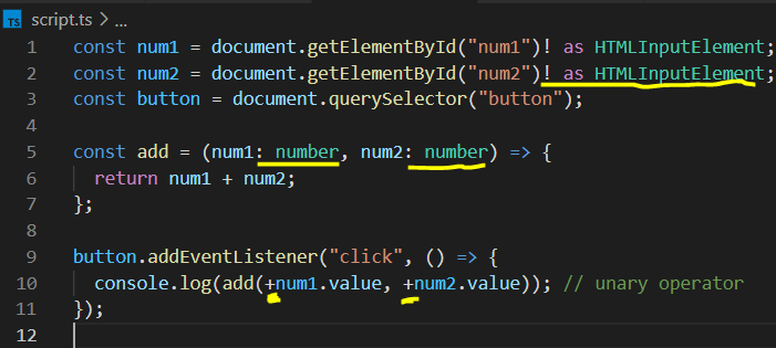 Now by using typescript we can write more robust code and enforce we are getting numbers insted of string values. Thus avoid runtime errors or unexpected results in our case. The screenshot below shows an example of typescript.
